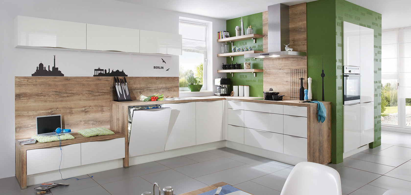 Diese moderne Küche bietet eine harmonische Farb- und Materialkombination mittels ultra-hochglänzenden Lackfronten in Weiß und warmen Arizona Pine Nachbildungen. Die interessant geplante Winkelküche besticht durch ergonomische Gesichtspunkte. So wird das Hochschrankmodul seitlich in der Wand eingekoffert, der Backofen hoch eingebaut und der Unterschrank als Lowboard funktioniert sowohl als Mediacenter sowie Sitzgelegenheit.
