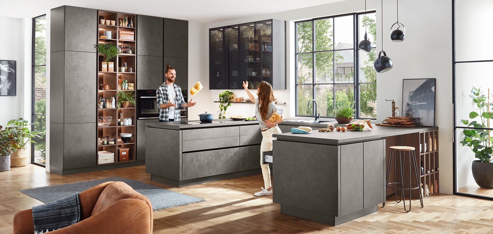 Die bis unter die Decke geplante Küche im Beton-Look setzt voll und ganz auf intelligenten Stauraum. Lieblingsstück ist hier der extrahohe Glas-Wandschrank Flat. Hilft nahezu unsichtbar: die Universal-Organisation Open Space, mit der sich Schubkästen individuell und variabel einteilen lassen.